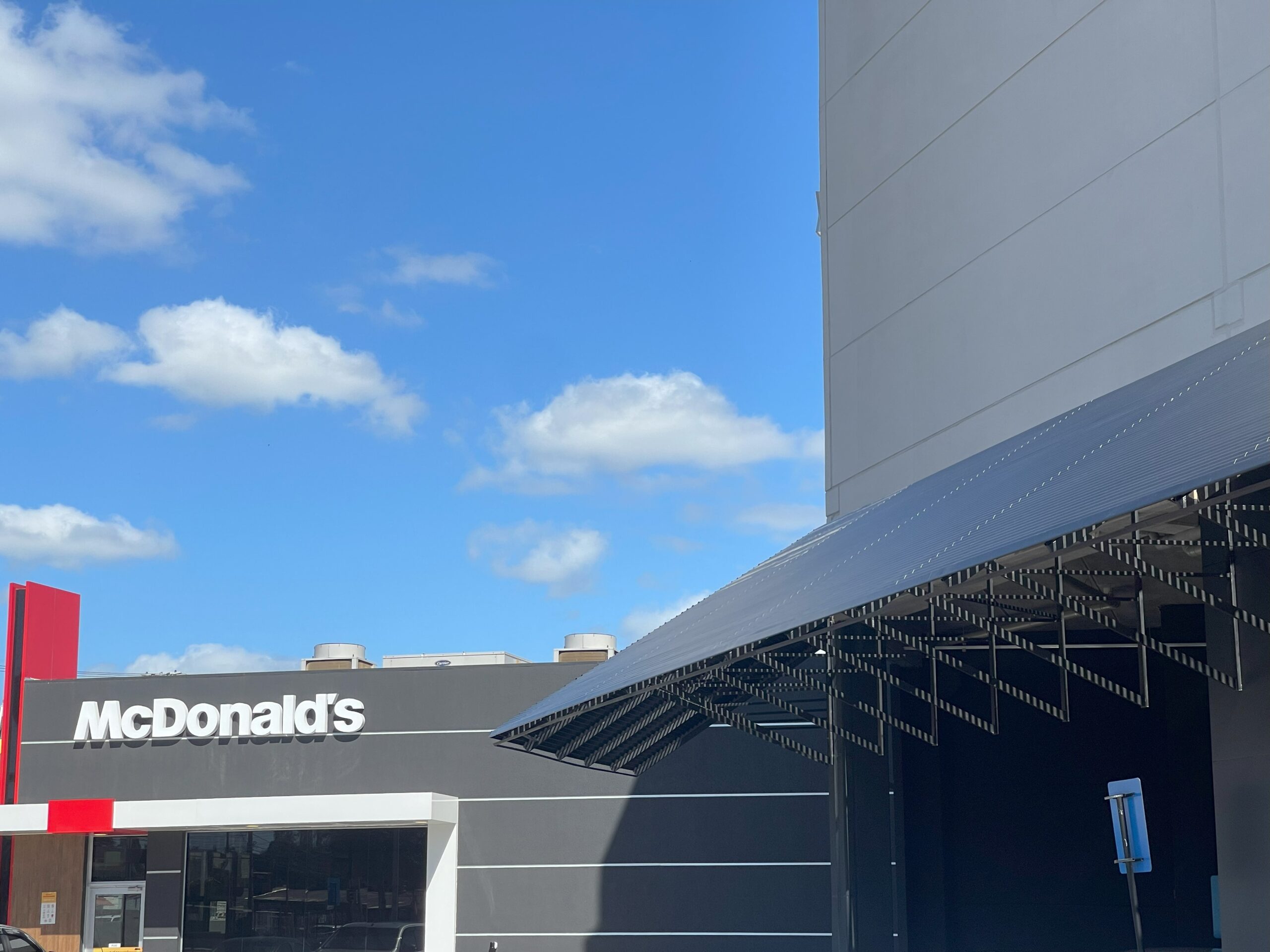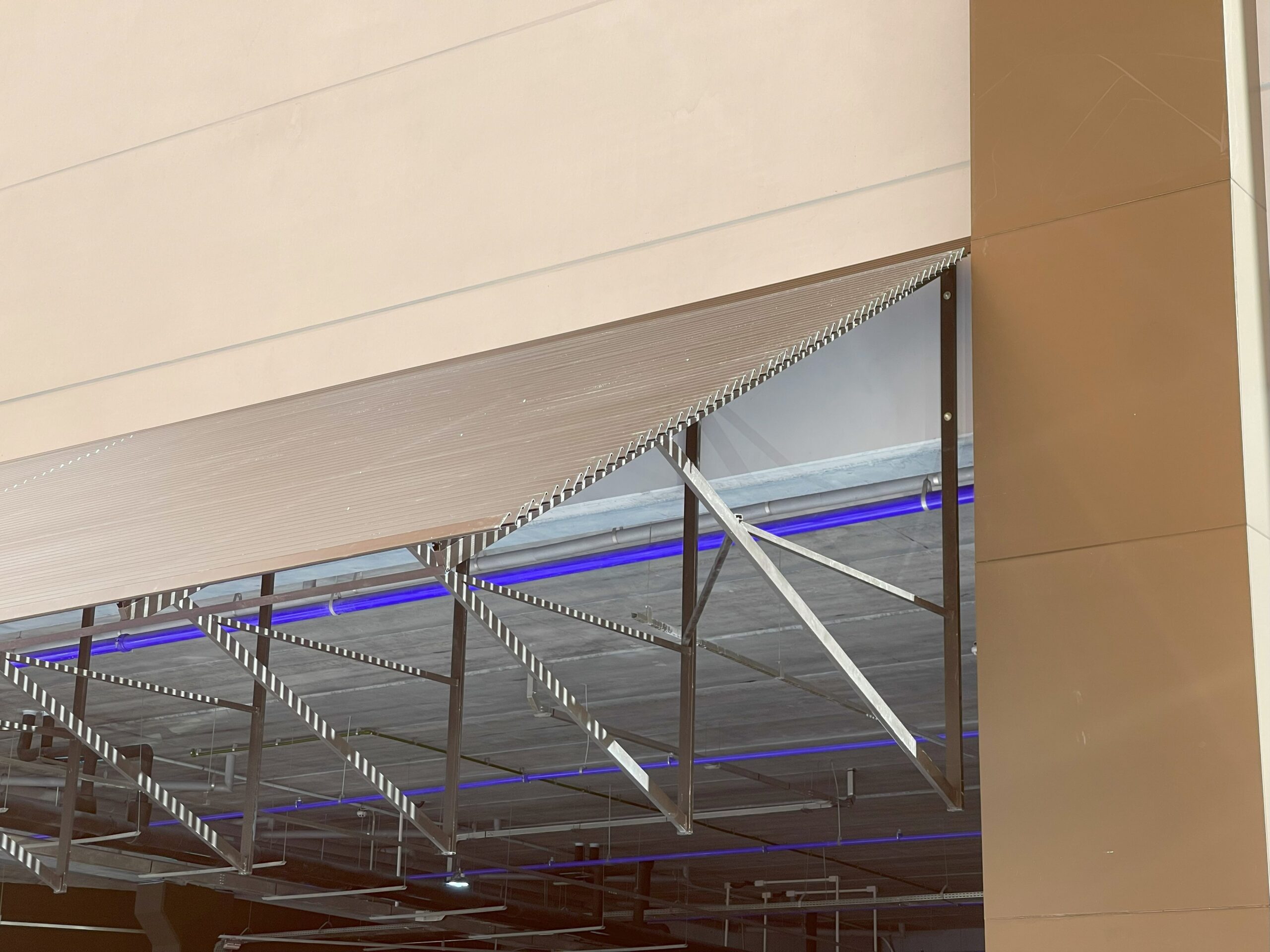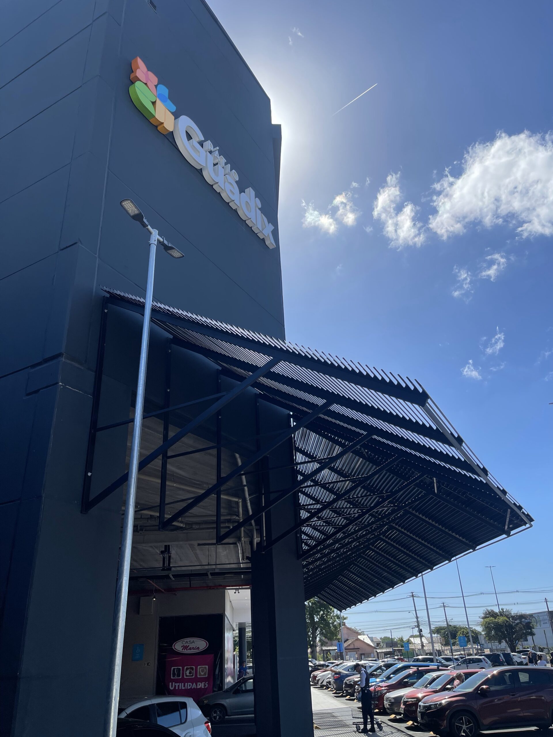 Para proteger pedestres e motoristas que se deslocam no estacionamento do shopping da chuva e do sol intensos, o cliente nos chamou para executar esse pergolado em brise venesianado modelo LC100 da REFAX, porém o diferencial deste projeto é que ele foi instalado em suportes desenvolvidos pela PlacoMaster à 45º em relação à edificação. Com isso, somado aos 45º de inclinação do próprio brise, o brise ficou a 90º da empena, ou seja, paralelo ao chão! E o resultado ficou fantástico, veja nas fotos!